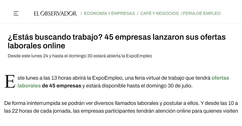 Este lunes a las 13 horas abrirá la ExpoEmpleo, una feria virtual de trabajo que tendrá ofertas laborales de 45 empresas y estará disponible hasta el domingo 30 de julio.